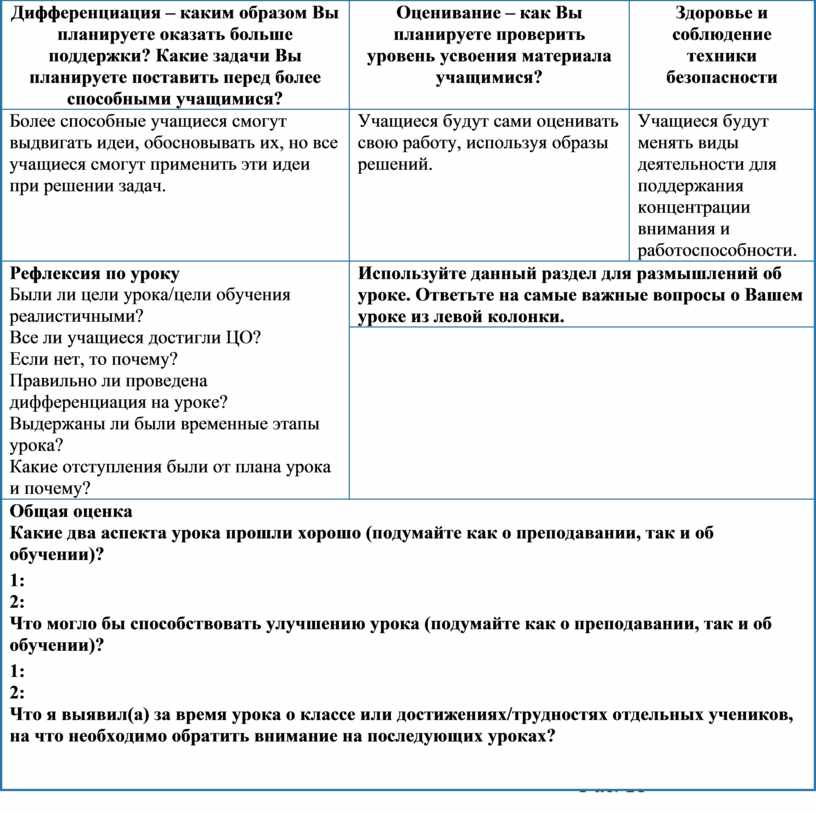 Общая оценка Какие два аспекта урока прошли хорошо (подумайте как о преподавании, так и об обучении)? 1: 2: Что могло бы способствовать улучшению урока (подумайте как о преподавании, так и об обучении)? 1: 2: Что я выявил(а) за время урока о классе или достижениях/трудностях отдельных учеников, на что необходимо обратить внимание на последующих уроках?