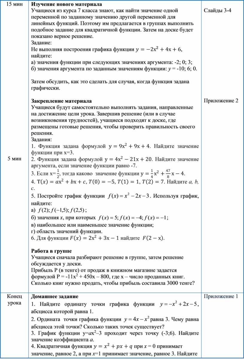 Учащиеся объясняют какие действия нужно выполнить для нахождения значения той или иной переменной, например, что для нахождения значения одной переменной по заданному значению другой переменной нужно подставить данное значение в формулу, которой задана эта функция Предметная лексика и терминология − квадратичная функция − функция − значение функции − аргумент − значение аргумента − дискриминант Серия полезных фраз для диалога/письма Заменим переменную х / у данным значением Найдем значение полученного выражения Решим полученное квадратное уравнение