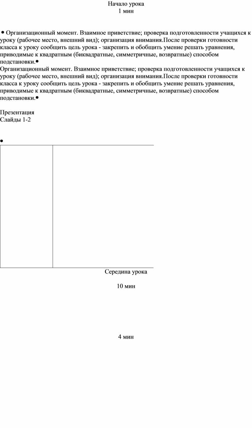 Организационный момент. Взаимное приветствие; проверка подготовленности учащихся к уроку (рабочее место, внешний вид); организация внимания.После проверки готовности класса к уроку сообщить цель урока - закрепить и обобщить умение решать уравнения, приводимые к квадратным (биквадратные, симметричные, возвратные) способом подстановки. |