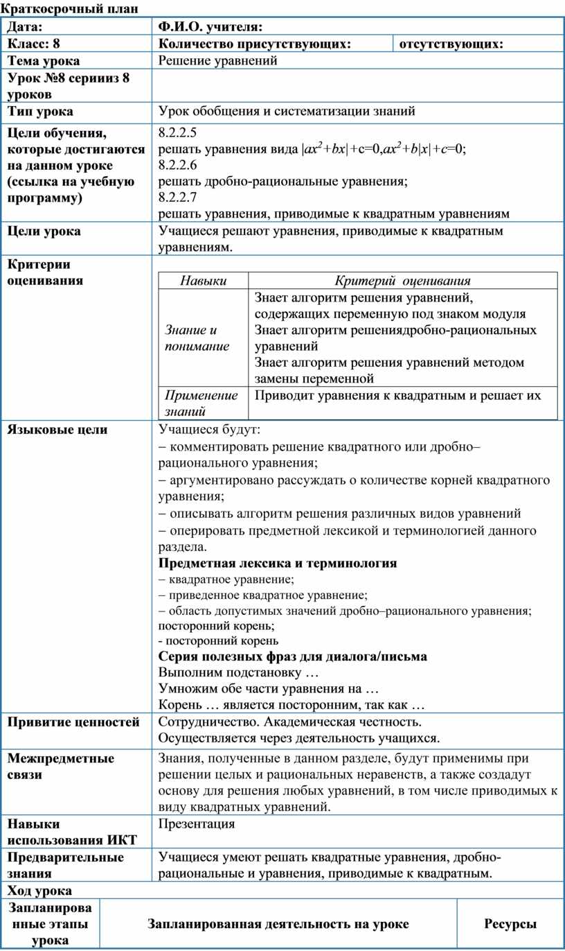 8.2.2.5 решать уравнения вида |ax2+bx|+c=0,ax2+b|x|+c=0; 8.2.2.6 решать дробно-рациональные уравнения; 8.2.2.7 решать уравнения, приводимые к квадратным уравнениям |