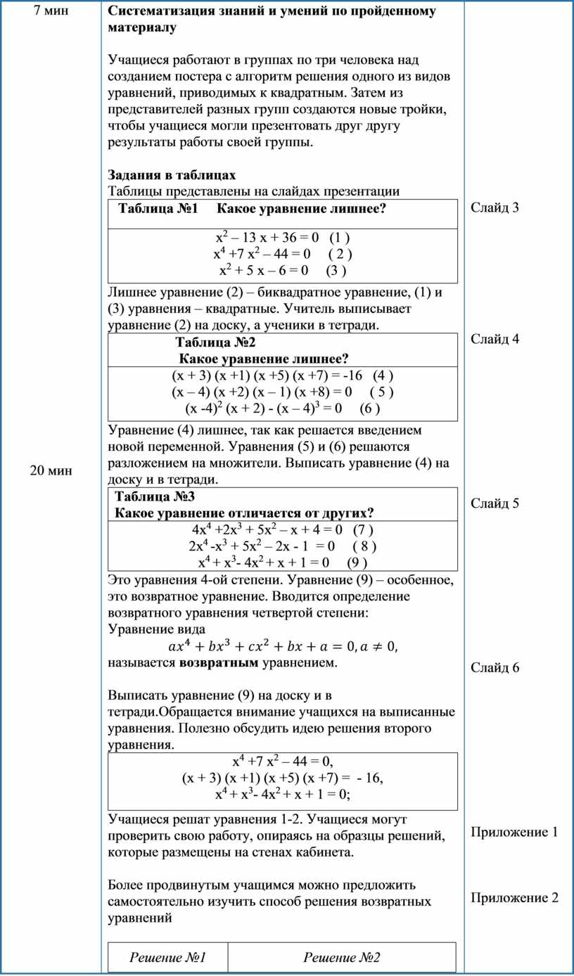 Лишнее уравнение (2) – биквадратное уравнение, (1) и (3) уравнения – квадратные. Учитель выписывает уравнение (2) на доску, а ученики в тетради.
