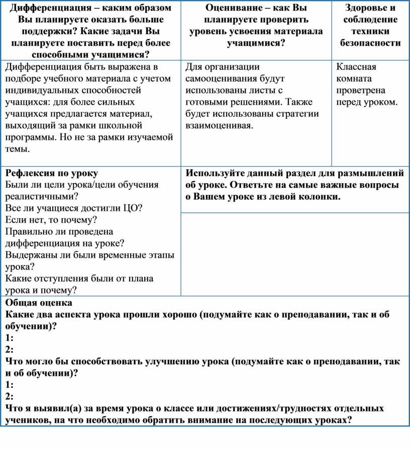 Используйте данный раздел для размышлений об уроке. Ответьте на самые важные вопросы о Вашем уроке из левой колонки. |