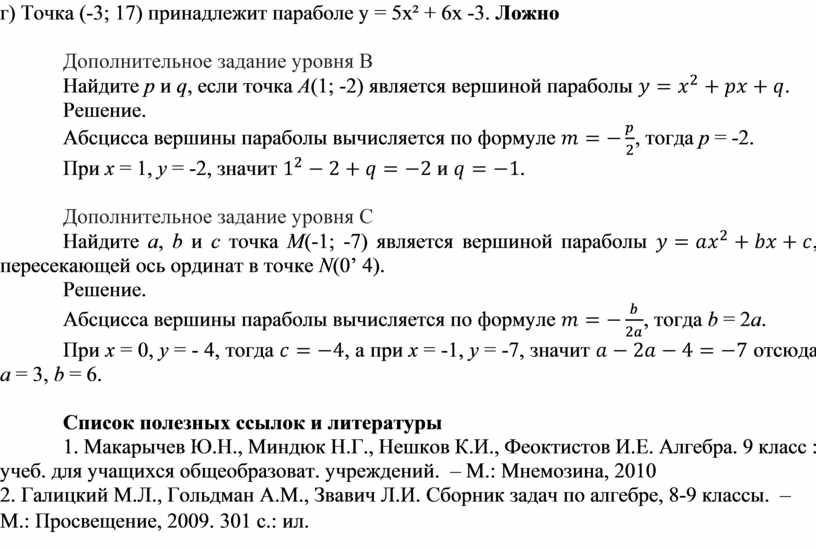 1. Макарычев Ю.Н., Миндюк Н.Г., Нешков К.И., Феоктистов И.Е. Алгебра. 9 класс : учеб. для учащихся общеобразоват. учреждений. – М.: Мнемозина, 2010
