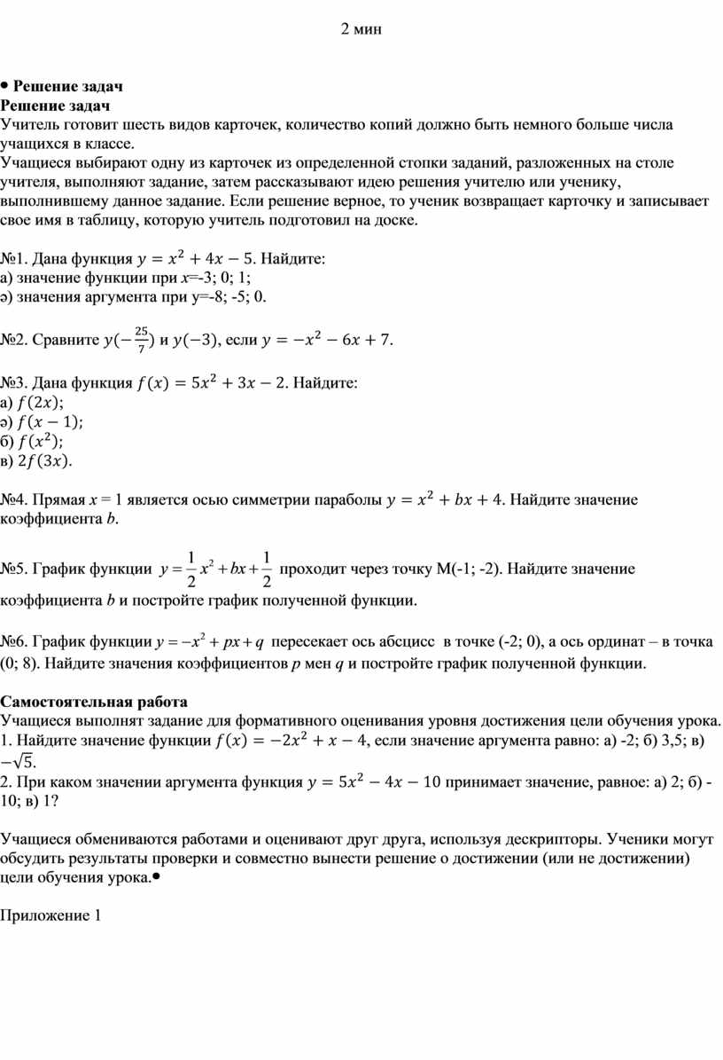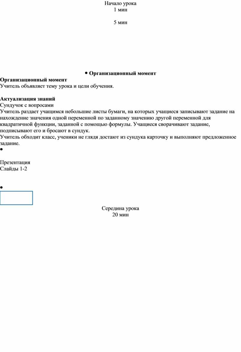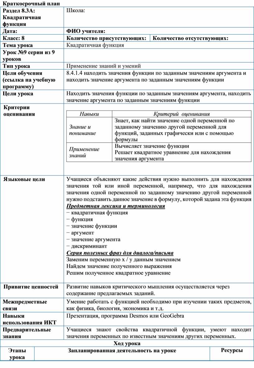 Учащиеся знают свойства квадратичной функции, умеют находит значения переменных по известным значениям других переменных. |
