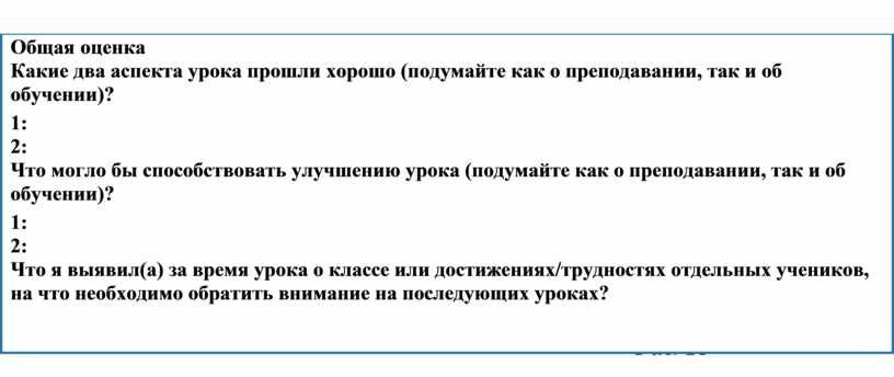 Общая оценка Какие два аспекта урока прошли хорошо (подумайте как о преподавании, так и об обучении)? 1: 2: Что могло бы способствовать улучшению урока (подумайте как о преподавании, так и об обучении)? 1: 2: Что я выявил(а) за время урока о классе или достижениях/трудностях отдельных учеников, на что необходимо обратить внимание на последующих уроках?