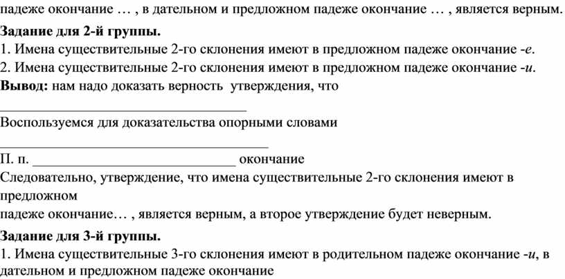 Задание для 1-й группы (на карточке). 1. Имена существительные 1-го склонения имеют в родительном падеже окончание -и, в дательном и предложном падеже окончание -е. 2. Имена существительные 1-го склонения имеют в родительном падеже окончание -ы, в дательном и предложном падеже окончание -е. Вывод: нам надо доказать верность утверждения, что ___________________________________ Воспользуемся для доказательства опорными словами Р. п. ____________________________ окончание