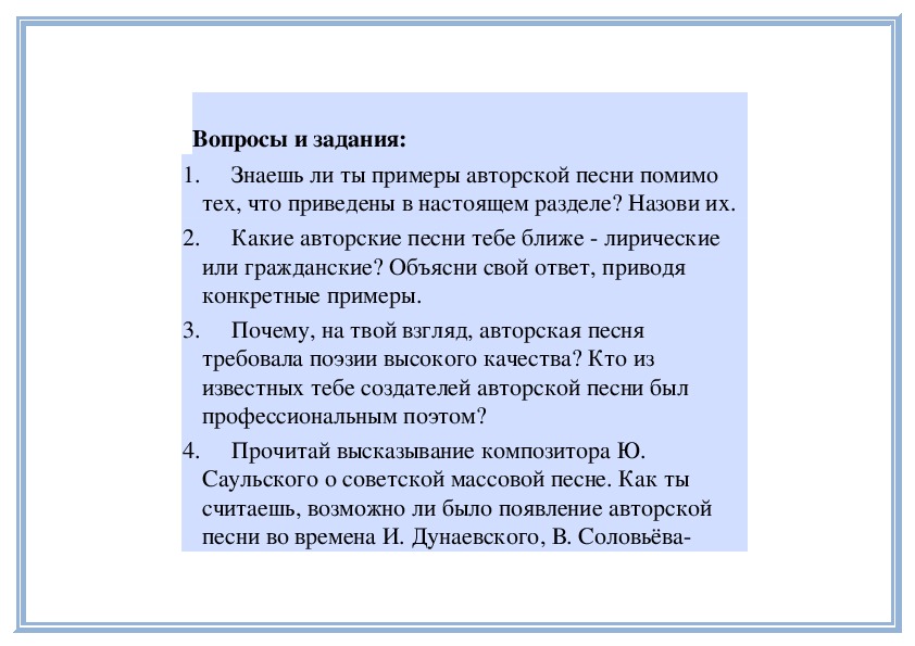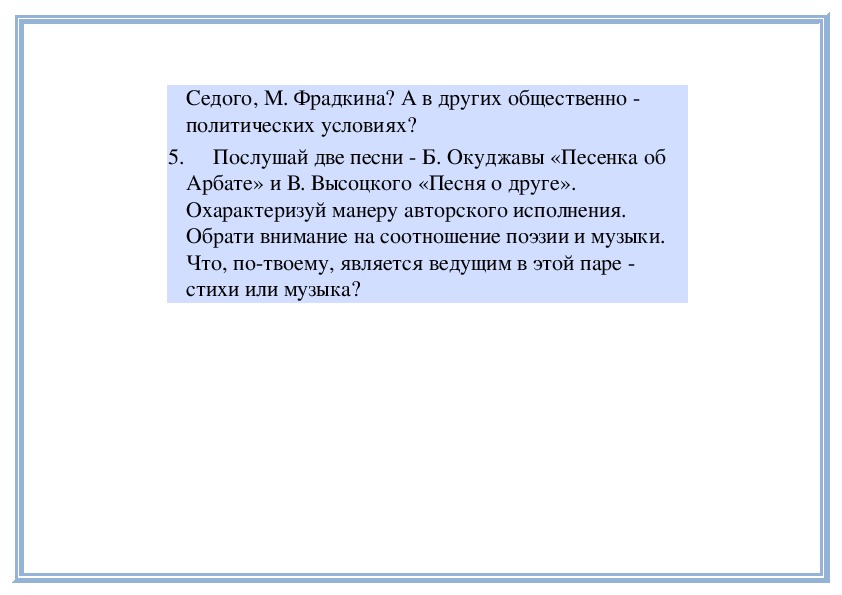 Галич, Ю. Визбор, Ю. Ким, А. Дольский.