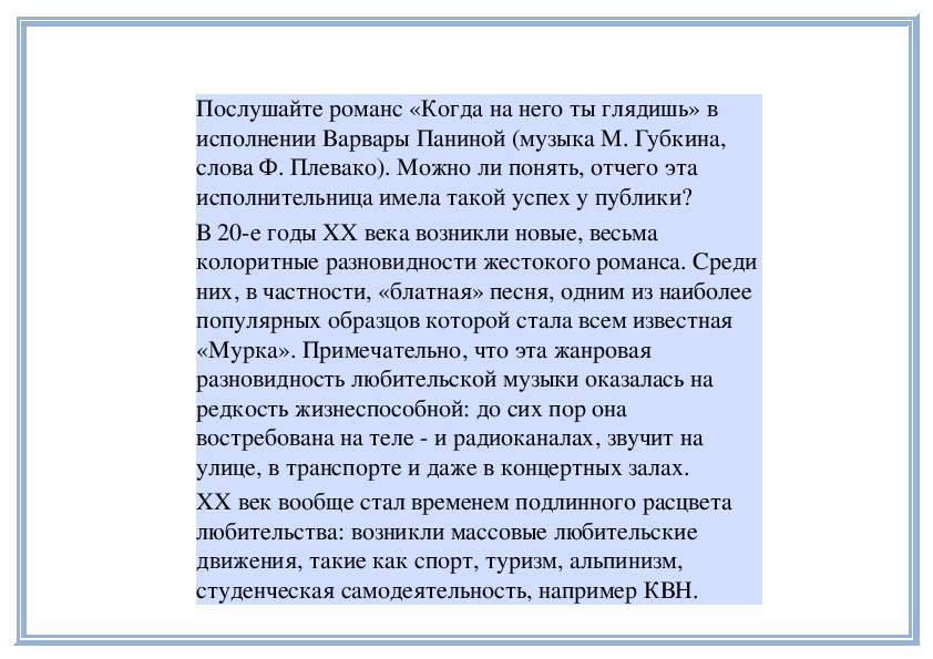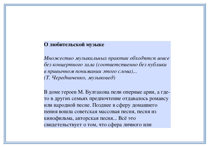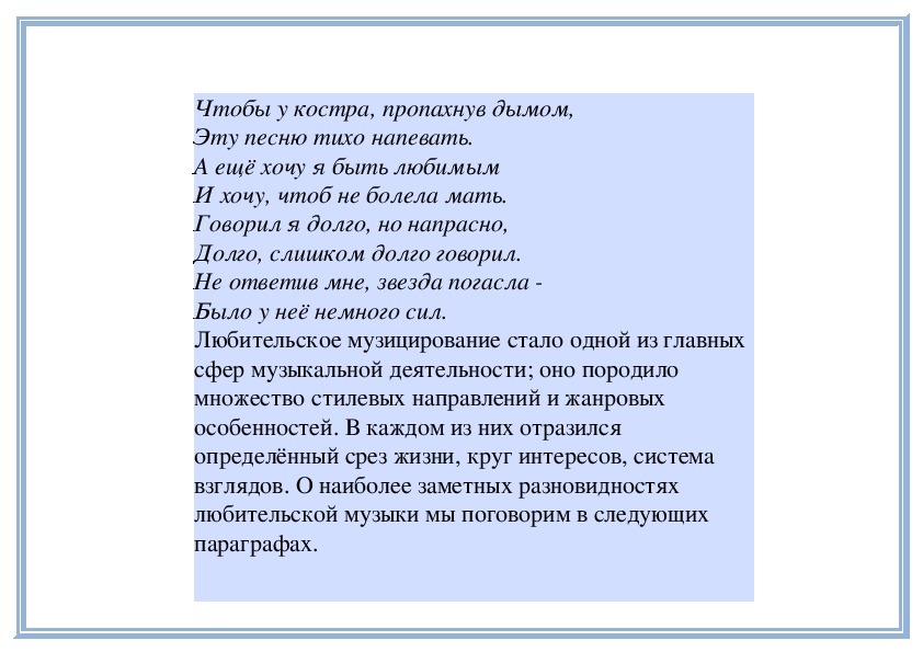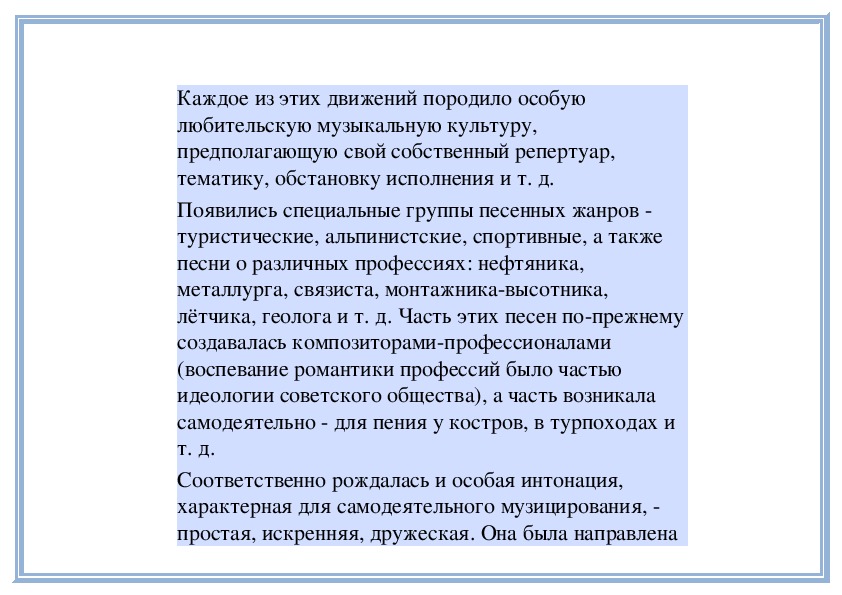 Как и в домашних занятиях музыкой, в любительских видах музицирования проявилась потребность в общении, взаимопонимании, поиске единомышленников. Это особенно обнаружилось в авторской песне, которая в течение нескольких десятилетий лидировала среди любительских музыкальных жанров. Наиболее известные создатели авторской песни - В. Высоцкий, Б. Окуджава, А. Галич, Ю. Визбор, Ю. Ким, А. Дольский.