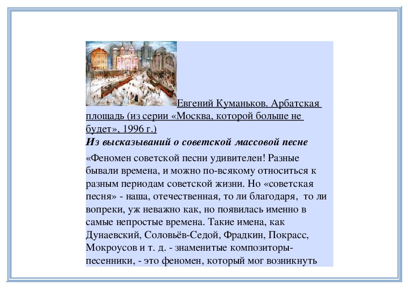 узнаваемым произведением.Евгений Куманьков. Арбатская