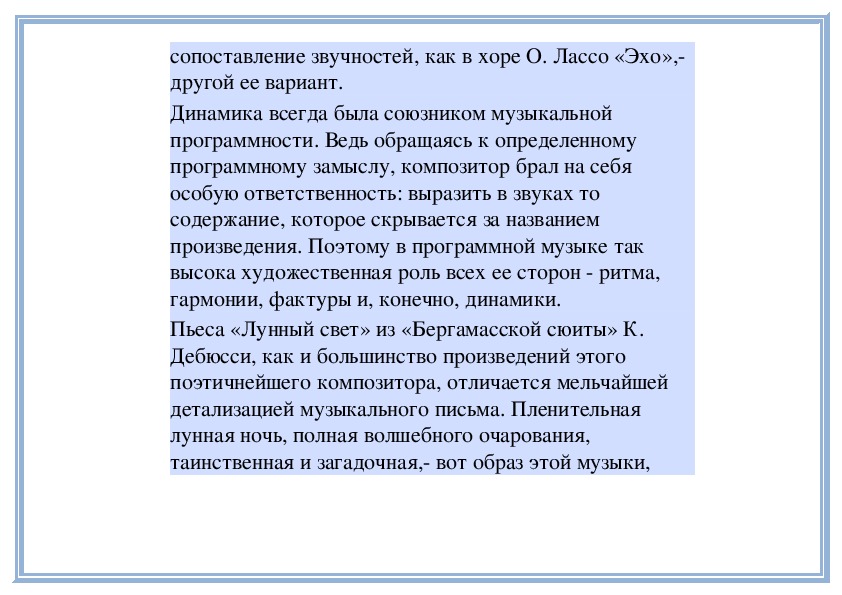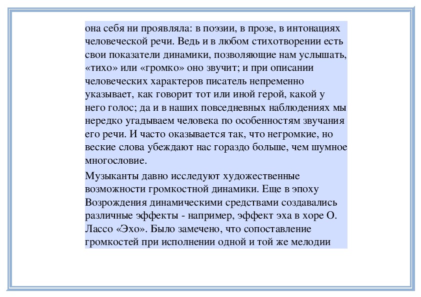 возможных вариантов динамики; контрастноесопоставление звучностей, как в хоре О. Лассо «Эхо»,