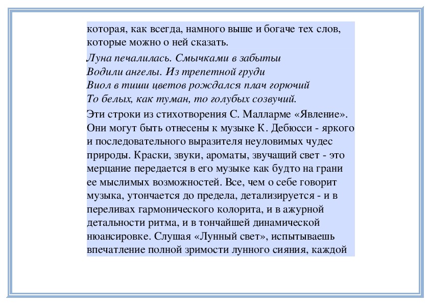 Они могут быть отнесены к музыке К. Дебюсси яркого