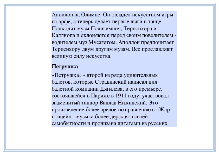 Балет «Аполлон Мусагет», созданный в 1927 году, принадлежит к неоклассическому периоду творчества Стравинского, без русского влияния и намёков на фольклор. Аполлон был богом солнца и предводителем муз (покровительниц наук, поэзии и искусств) у древних греков. Музыка написана для нежных звуков струнного оркестра и по образцу элегантных «классических» балетов, исполняемых при дворе французского короля Людовика XIV. Названия самих танцев соответствуют «классическому» стилю.
