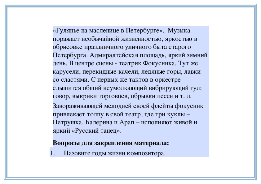 аспект был весьма нов для танцевального мира.«Гулянье на масленице в Петербурге». Музыка