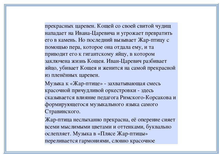 Это было первое крупное сочинение Стравинского. Премьера балета, написанного для труппы Дягилева «Русский балет», состоялась в 1910 году. Великая балерина Тамара Карсавина исполняла главную партию, и этот спектакль открыл новую главу в истории балета.