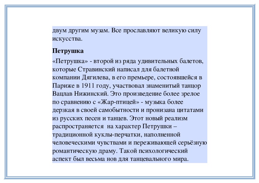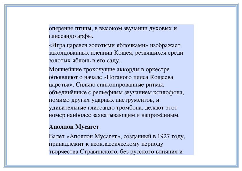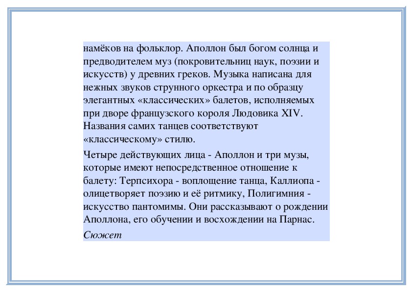 творчества Стравинского, без русского влияния инамёков на фольклор. Аполлон был богом солнца и