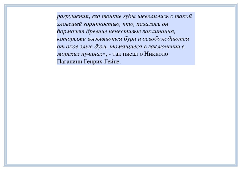 «Я едва мог узнать его в коричневой монашеской рясе, которая скорее скрывала, чем одевала его. С каким-то диким выражением на лице, наполовину спрятанным под капюшоном, опоясанный веревкою, босой, одинокий и гордый, стоял Паганини на нависшей над морем скале и играл на скрипке. Происходило это, как мне казалось, в сумерки; багровые блики заката ложились на широкие морские волны, которые становились все краснее и в таинственном созвучии с мелодиями скрипки шумели все торжественнее. Но все порывистее и смелее становились звуки скрипки; в глазах страшного артиста сверкала такая вызывающая жажда разрушения, его тонкие губы шевелились с такой зловещей горячностью, что, казалось он бормочет древние нечестивые заклинания, которыми вызываются бури и освобождаются от оков злые духи, томящиеся в заключении в морских пучинах», - так писал о Никколо Паганини Генрих Гейне.