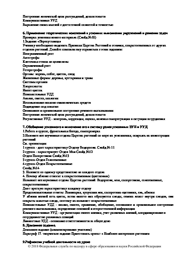 Предметные: Учащиеся закрепляют знания общей характеристики царства Растения, учатся выделять