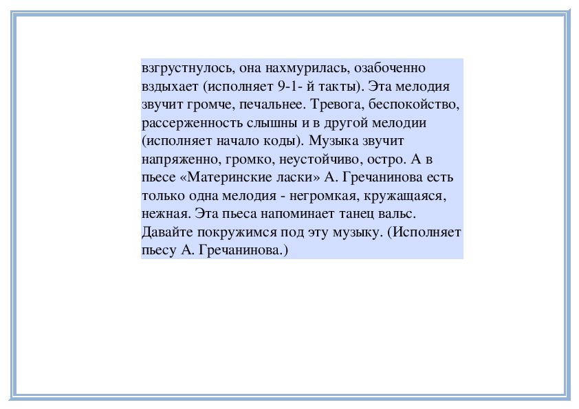 Теперь послушайте «Материнские ласки» А. Гречанинова и скажите, эта пьеса звучит по-разному или в ней преобладает одно настроение? Меняется ли характер музыки? (Исполняет пьесу.)