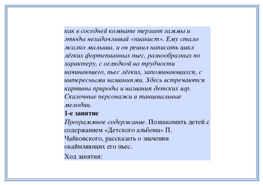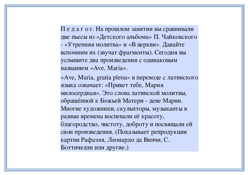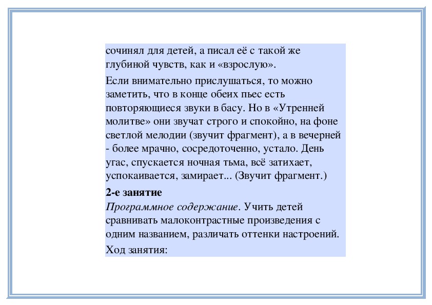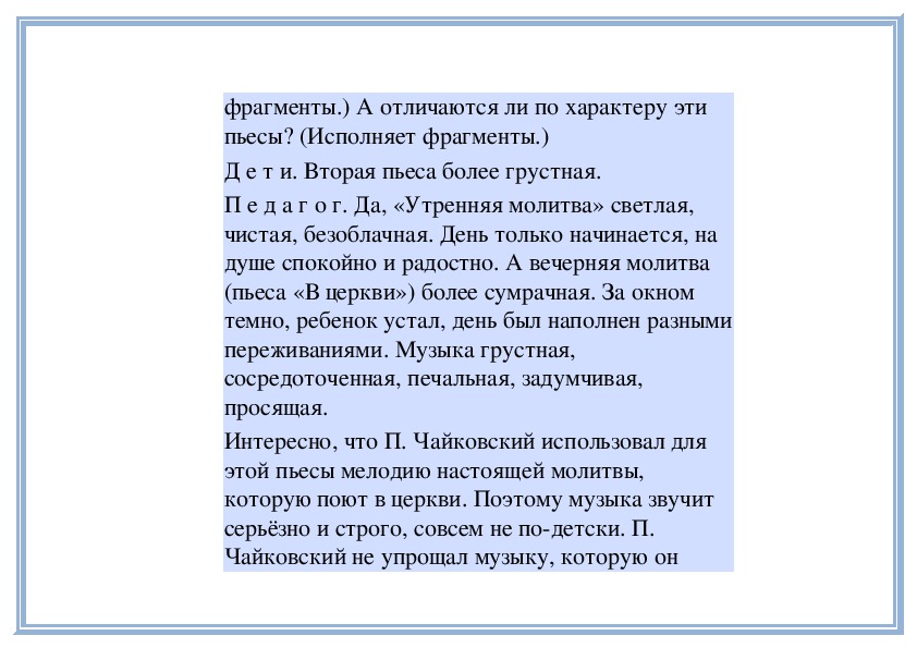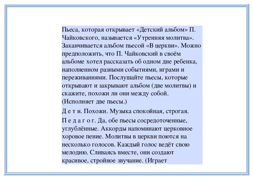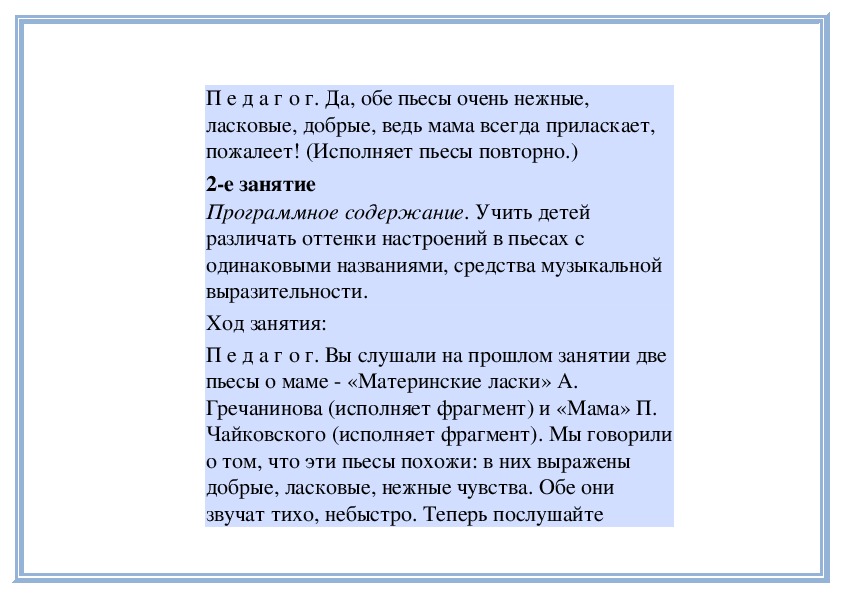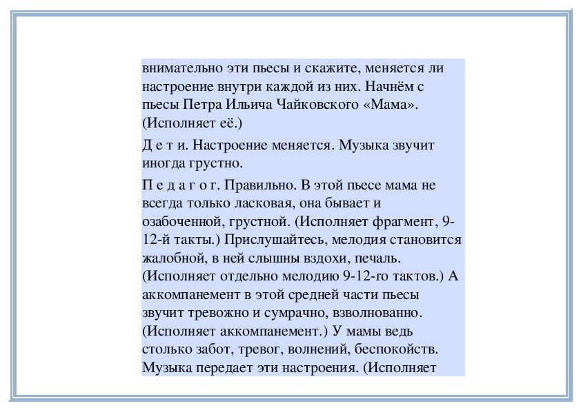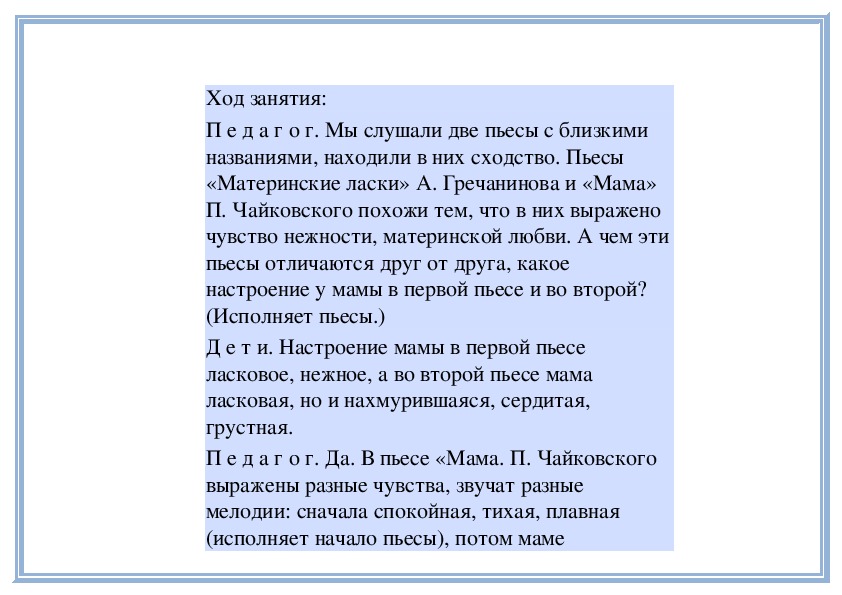П е д а г о г. Вы слушали на прошлом занятии две пьесы о маме - «Материнские ласки» А. Гречанинова (исполняет фрагмент) и «Мама» П. Чайковского (исполняет фрагмент). Мы говорили о том, что эти пьесы похожи: в них выражены добрые, ласковые, нежные чувства. Обе они звучат тихо, небыстро. Теперь послушайте внимательно эти пьесы и скажите, меняется ли настроение внутри каждой из них. Начнём с пьесы Петра Ильича Чайковского «Мама». (Исполняет её.)