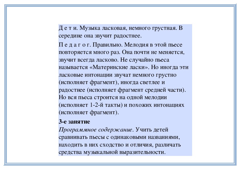 П е д а г о г. Да, обе пьесы очень нежные, ласковые, добрые, ведь мама всегда приласкает, пожалеет! (Исполняет пьесы повторно.)