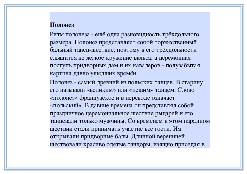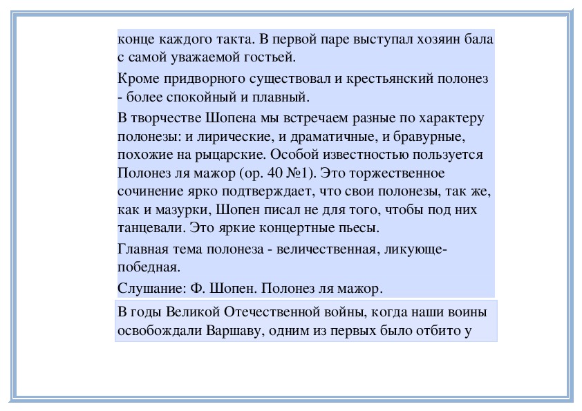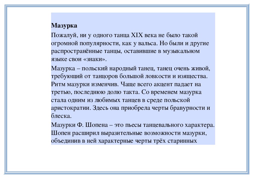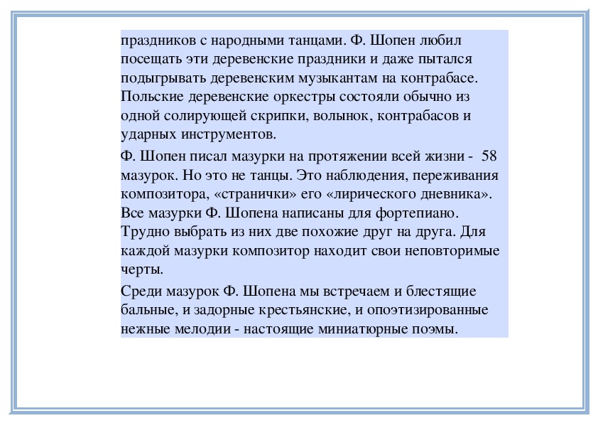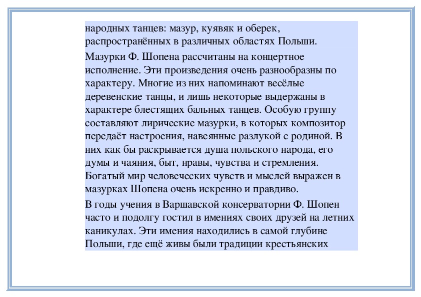 Польши, где ещё живы были традиции крестьянскихпраздников с народными танцами. Ф. Шопен любил