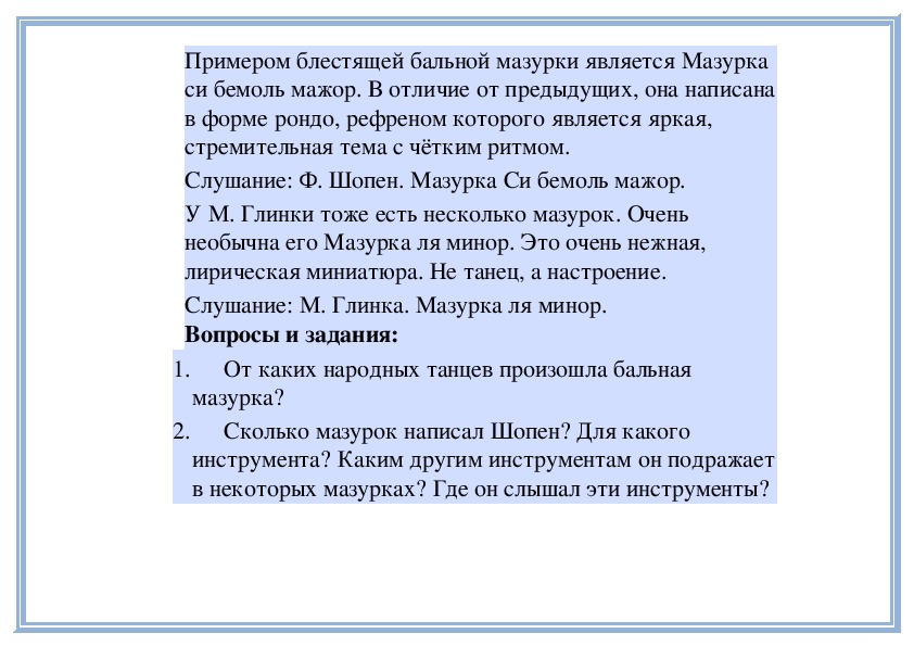 Слушание: Ф. Шопен. Мазурка Си бемоль мажор.