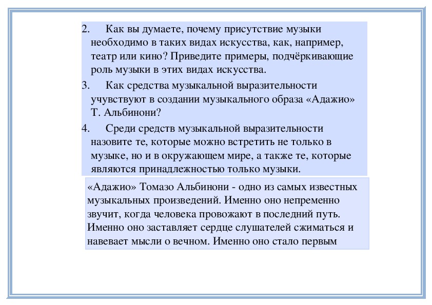 Музыкальный материал:Т. Альбинони. Адажио (слушание произведения в разных