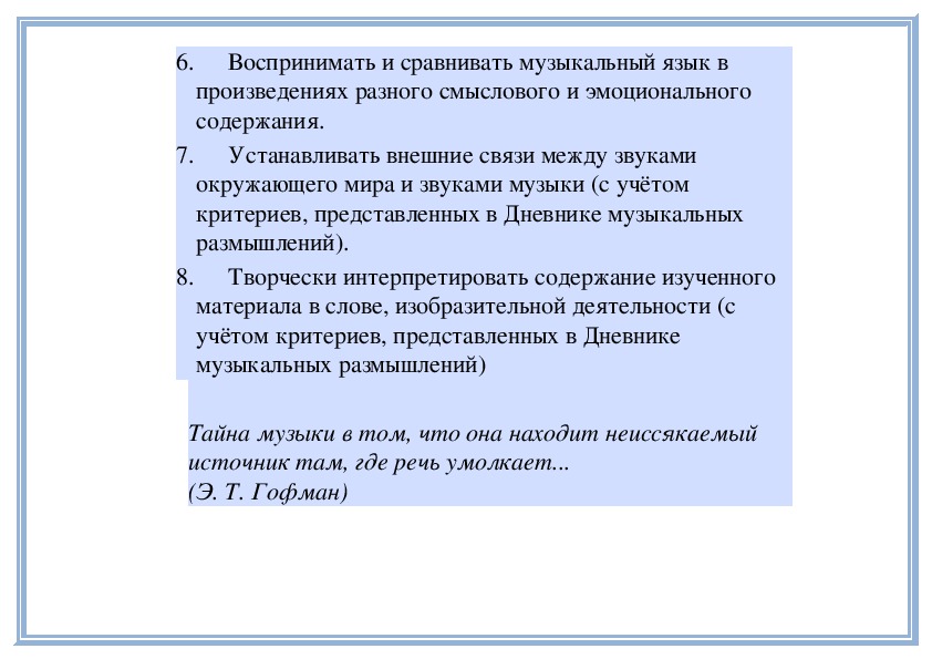 6. Воспринимать и сравнивать музыкальный язык в произведениях разного смыслового и эмоционального содержания.