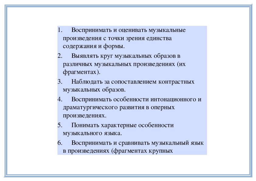 1. Воспринимать и оценивать музыкальные произведения с точки зрения единства содержания и формы.