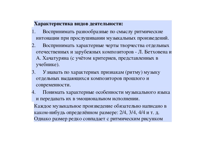 1. Воспринимать разнообразные по смыслу ритмические интонации при прослушивании музыкальных произведений.