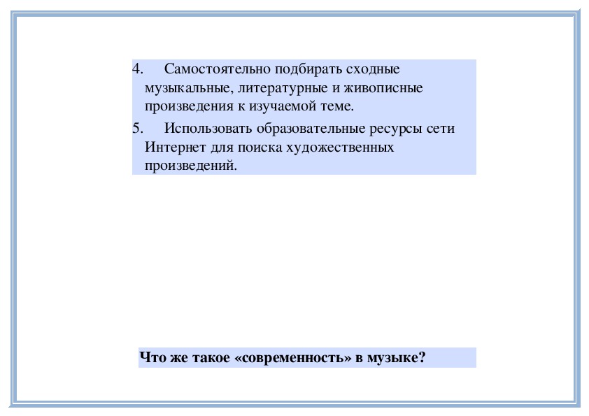 5. Осуществлять поиск музыкально-образовательной информации в сети Интернет.