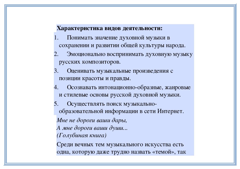 4. Осознавать интонационно-образные, жанровые и стилевые основы русской духовной музыки.