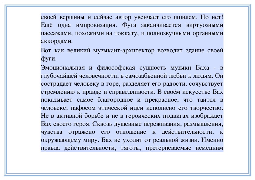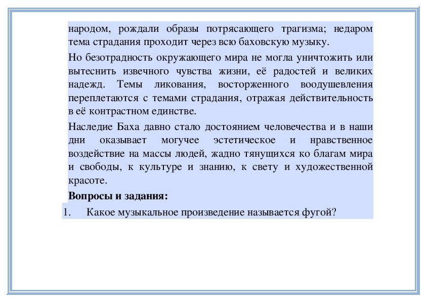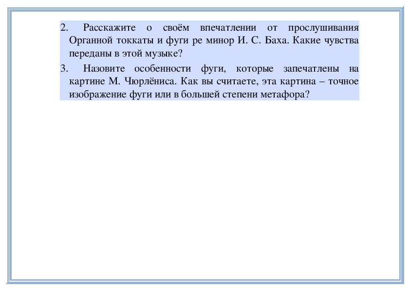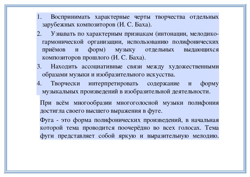2. Узнавать по характерным признакам (интонации, мелодико-гармонической организации, использованию полифонических приёмов и форм) музыку отдельных выдающихся композиторов прошлого (И. С. Баха).