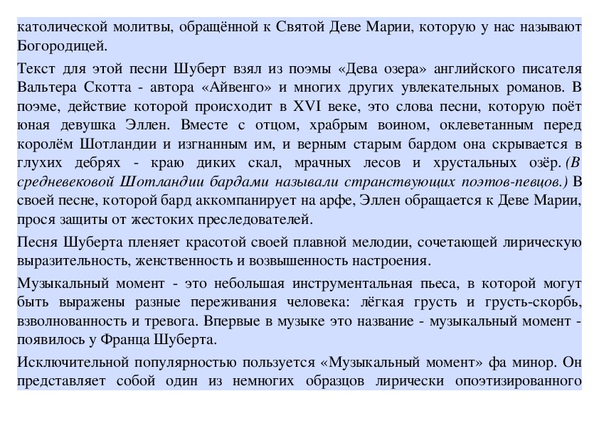 популярным религиозным сочинением Шуберта. «Ave Maria» начальные словакатолической молитвы, обращённой к Святой Деве Марии, которую у нас называют