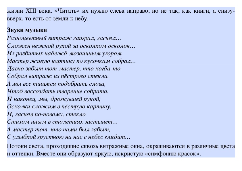 церковного хора, возникают переплетения голосов (полифония), словно рисует ввоображении слушателя величественный собор с витражами, арками и шпилями,