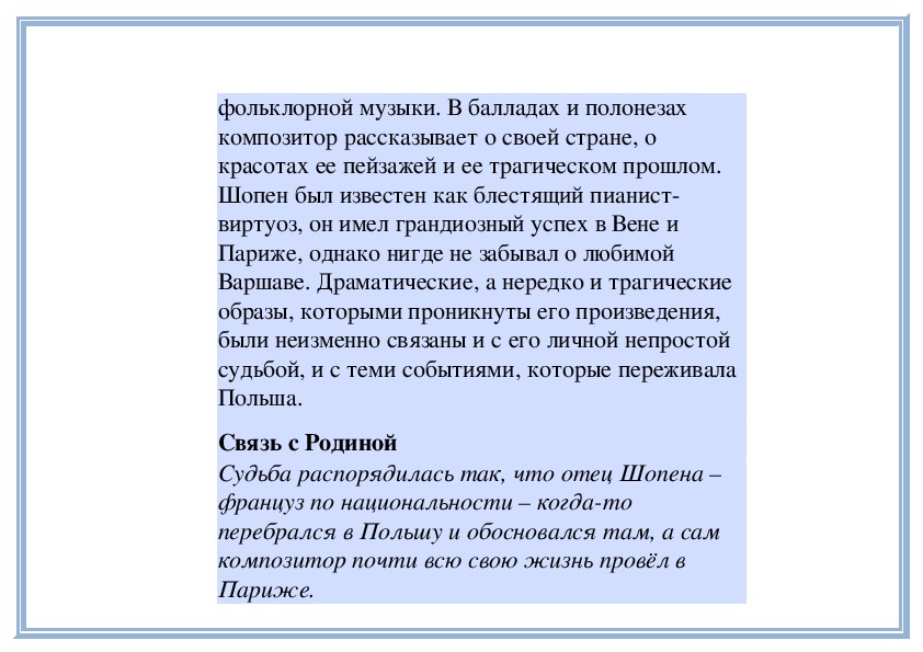 ритмы мазурки, разнообразные интонациифольклорной музыки. В балладах и полонезах