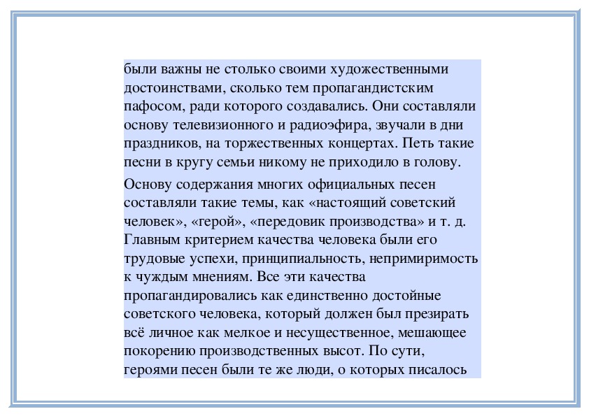 Основу содержания многих официальных песен составляли такие темы, как «настоящий советский человек», «герой», «передовик производства» и т. д.