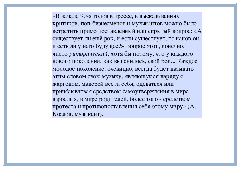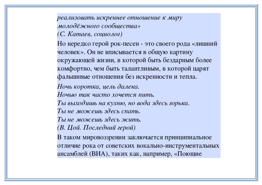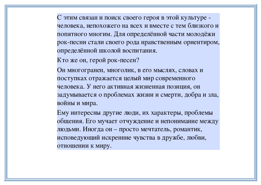 Наверное, не будет ошибочным утверждение, что авторы рок-песен выражают в своём творчестве собственные взгляды на мир, собственные чувства и идеалы. Можно сказать, что, несмотря на различия жизненного опыта, творческих подходов и т. д., музыкантами был создан обобщённый образ «героя нашего времени» - возможно, несвободный от ошибок и заблуждений, но в то же время обаятельный и живой.