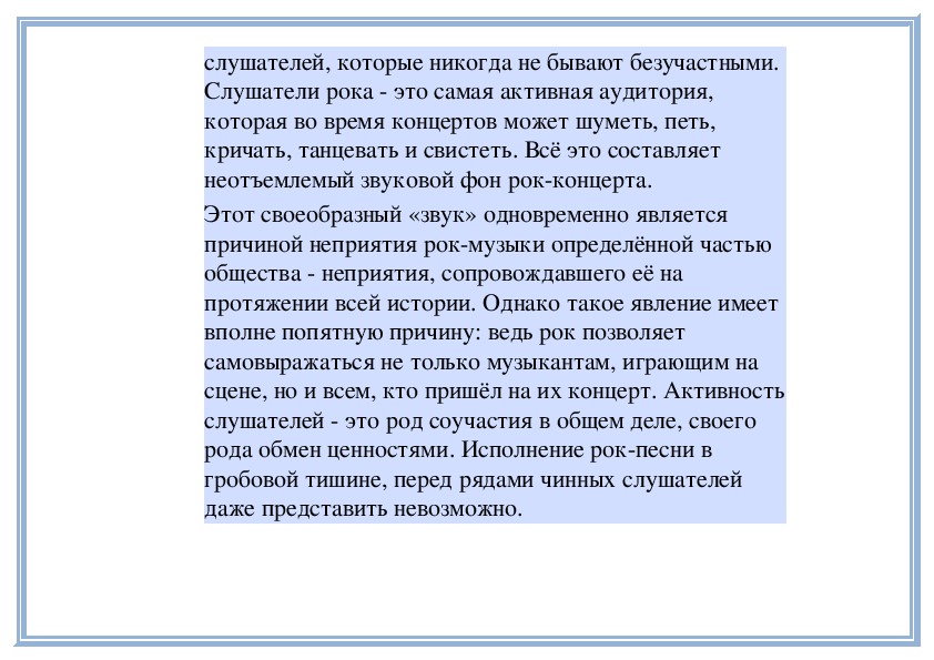 Не случайно этот вид музыки так заразителен; он способен собирать многотысячные стадионы слушателей, которые никогда не бывают безучастными. Слушатели рока - это самая активная аудитория, которая во время концертов может шуметь, петь, кричать, танцевать и свистеть. Всё это составляет неотъемлемый звуковой фон рок-концерта.