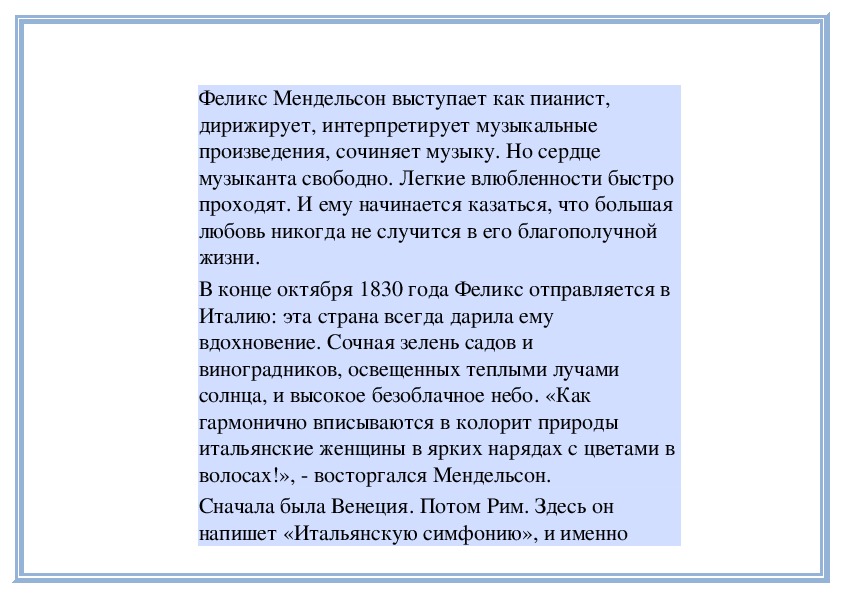 напишет «Итальянскую симфонию», и именноздесь в его воображении возникнет образ любимой