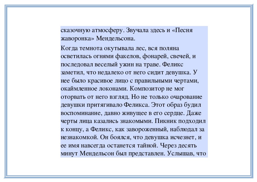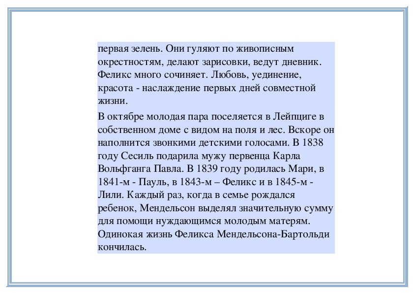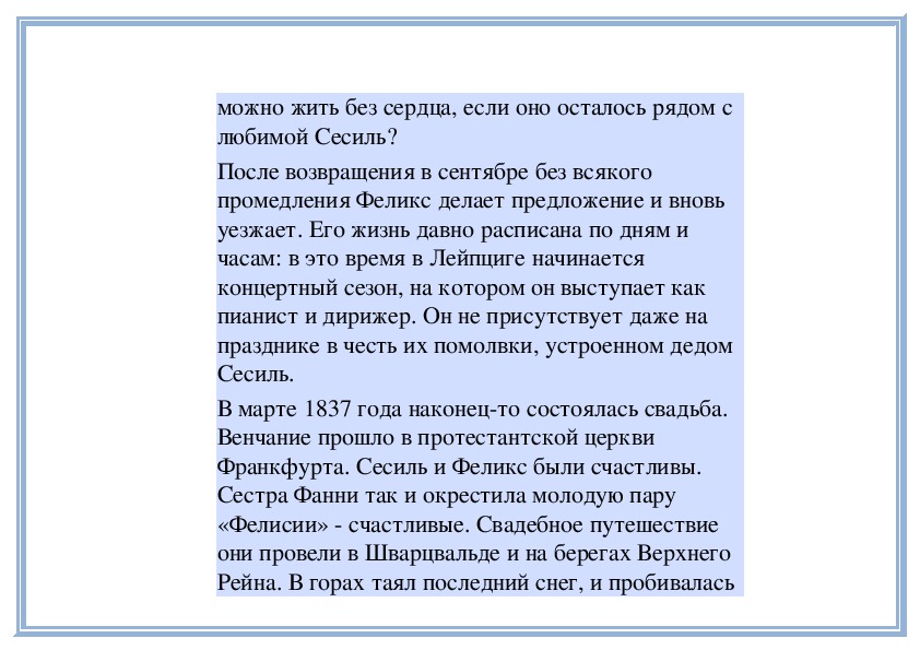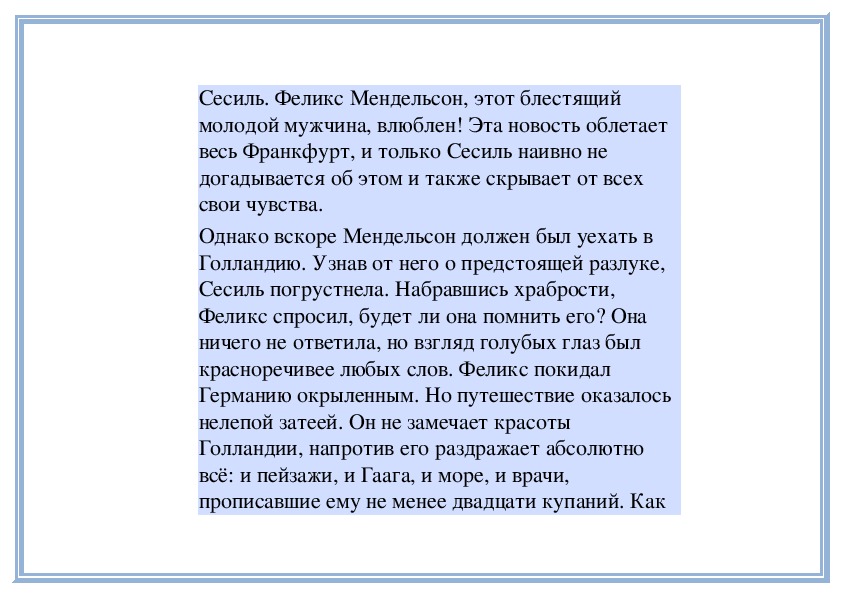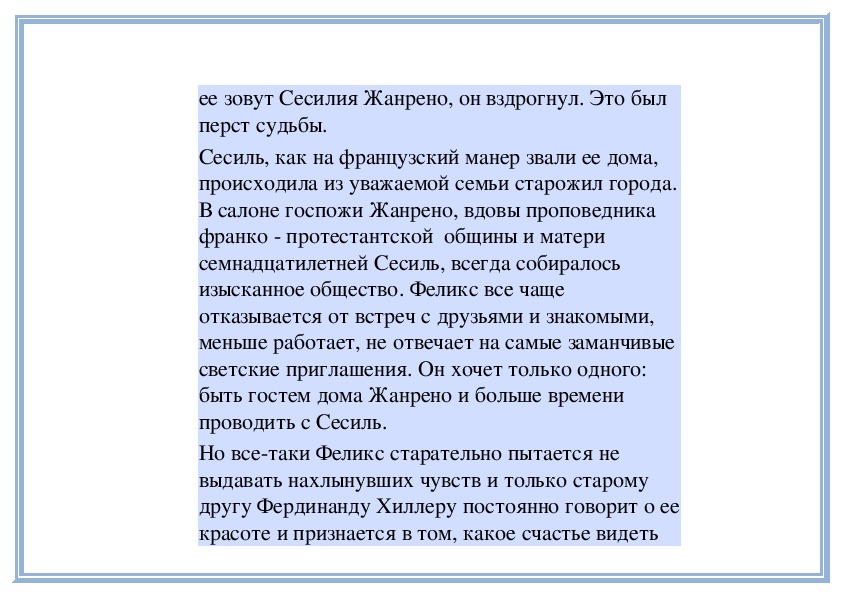 минут Мендельсон был представлен. Услышав, чтоее зовут Сесилия Жанрено, он вздрогнул. Это был