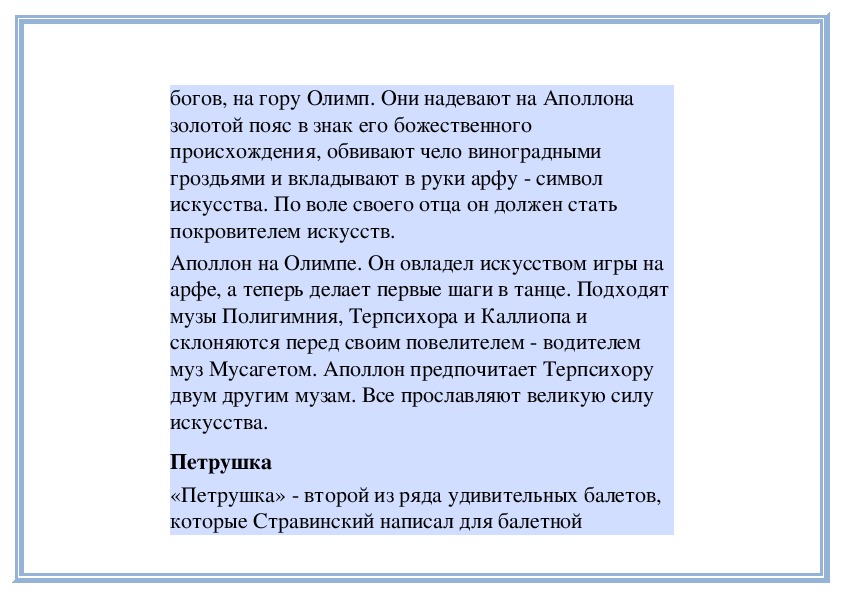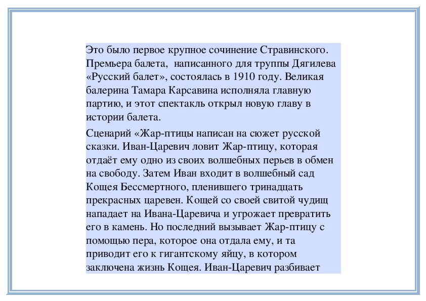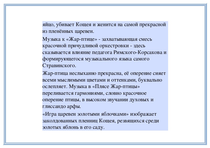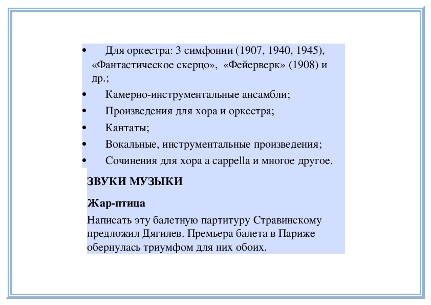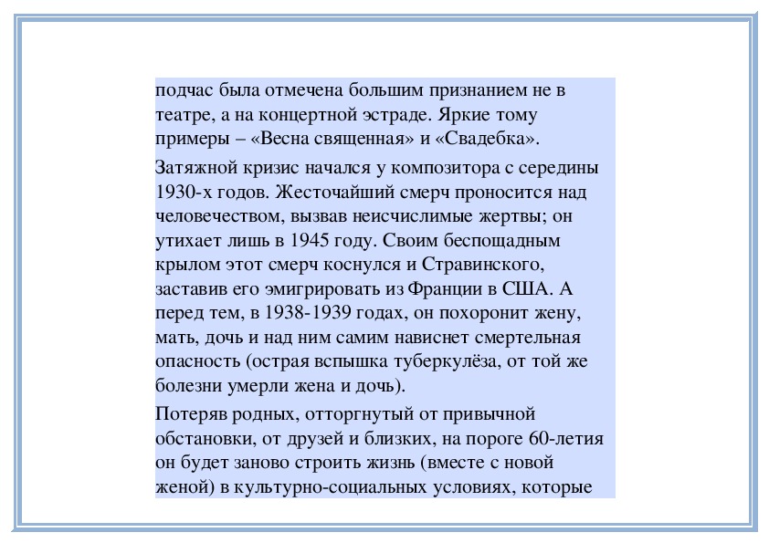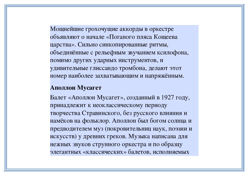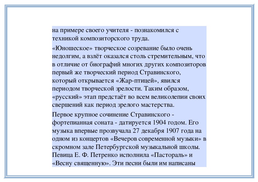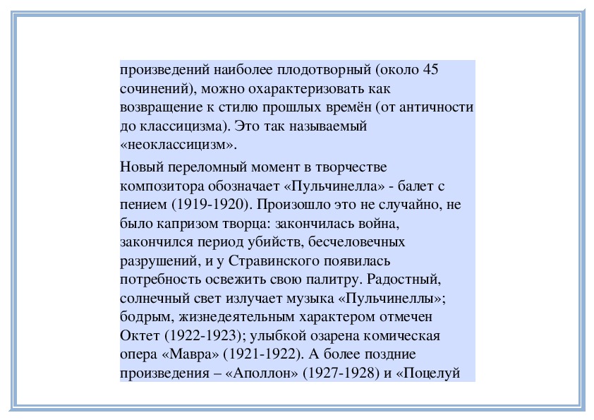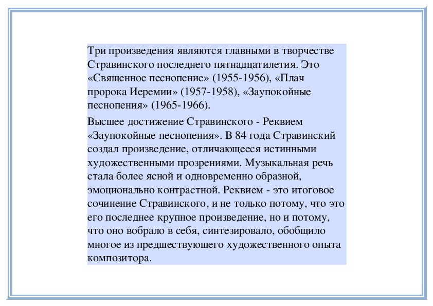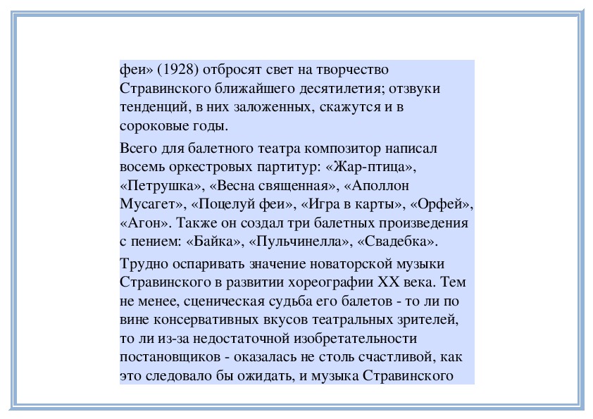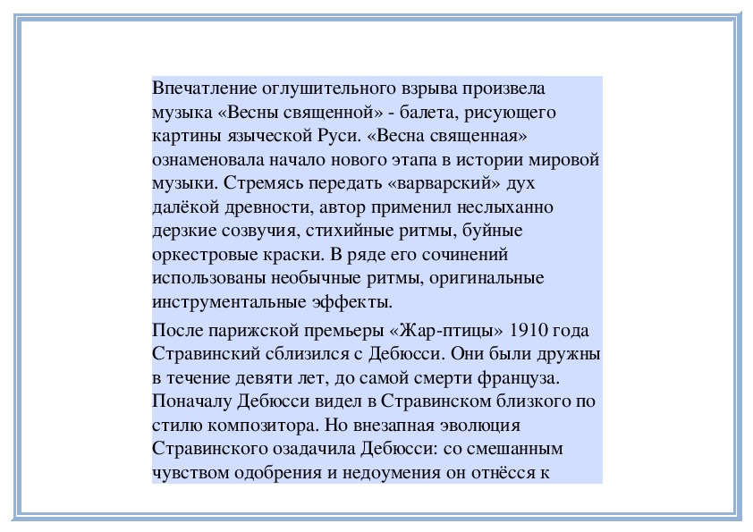 исключительно индивидуальное творение.Стравинский утверждал, что его музыка словно