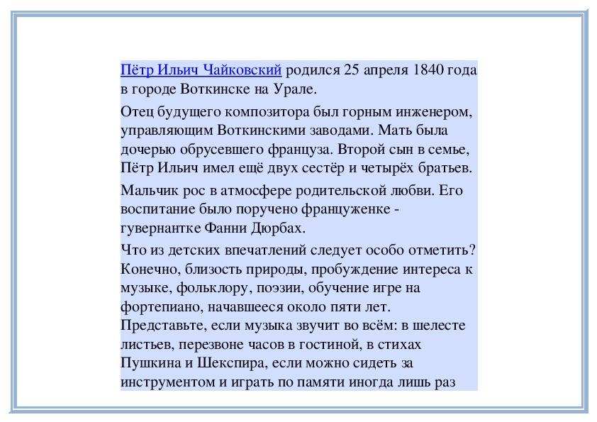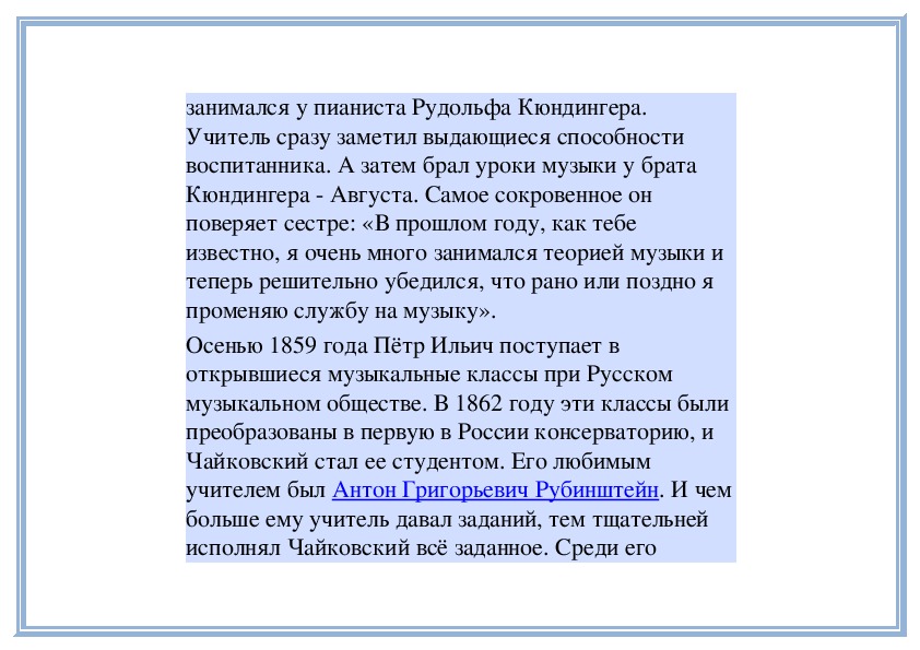С девяти лет у него появилась учительница музыки.Но главным воспоминанием Стравинского об этих