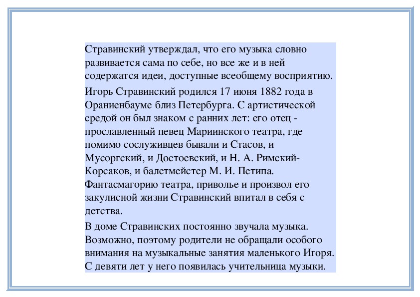 Игорь Стравинский родился 17 июня 1882 года в Ораниенбауме близ Петербурга. С артистической средой он был знаком с ранних лет: его отец - прославленный певец Мариинского театра, где помимо сослуживцев бывали и Стасов, и Мусоргский, и Достоевский, и Н. А. Римский-Корсаков, и балетмейстер М. И. Петипа. Фантасмагорию театра, приволье и произвол его закулисной жизни Стравинский впитал в себя с детства.
