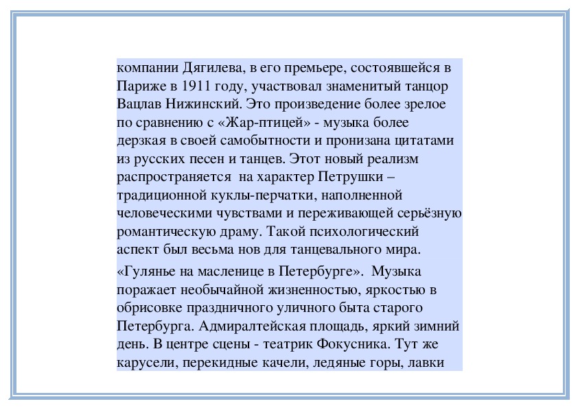 героя Петрушки, обманутого ветреной Балериной.Впечатление оглушительного взрыва произвела
