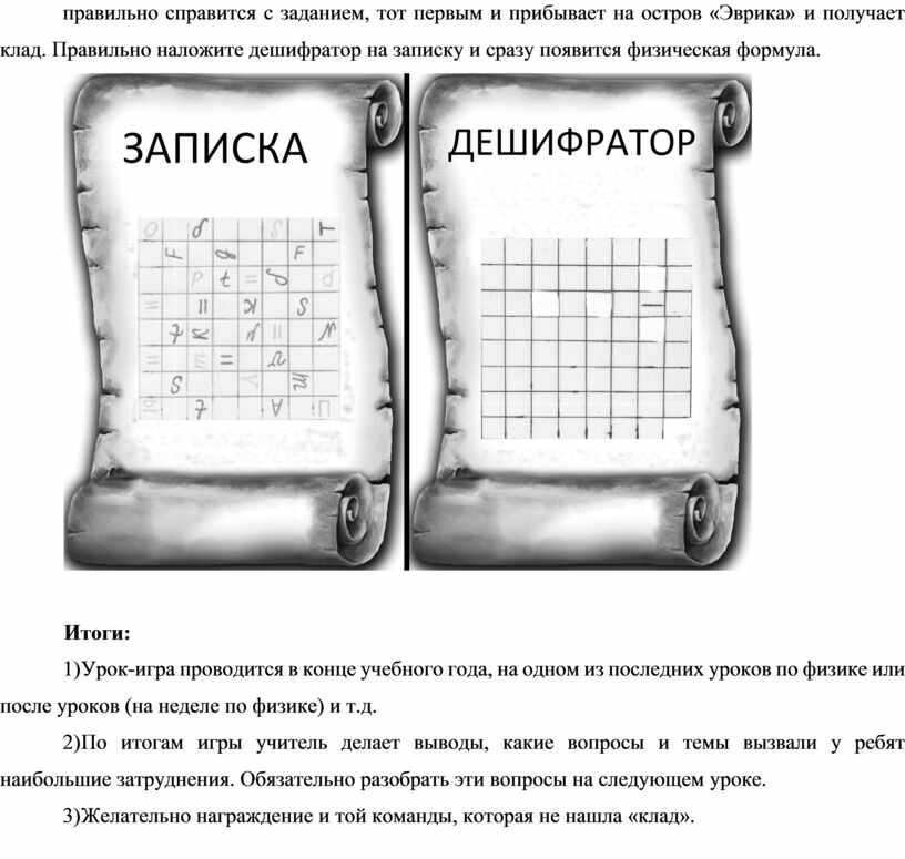 На острове подсчитываются очки (баллы) каждой группы, но чтобы добраться до острова «Эврика», где спрятан клад, каждая группа получает еще по одному заданию. Кто быстрее и правильно справится с заданием, тот первым и прибывает на остров «Эврика» и получает клад. Правильно наложите дешифратор на записку и сразу появится физическая формула.
