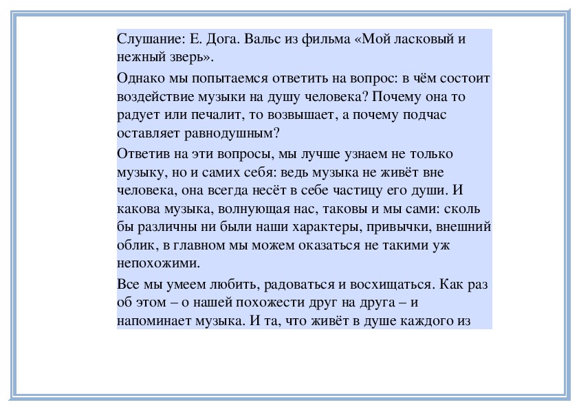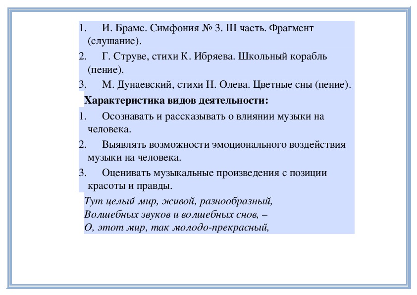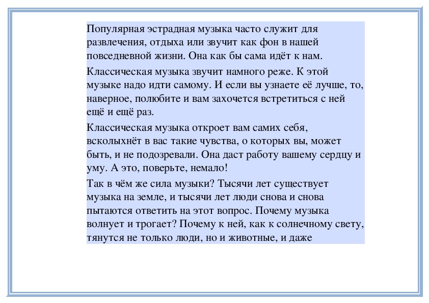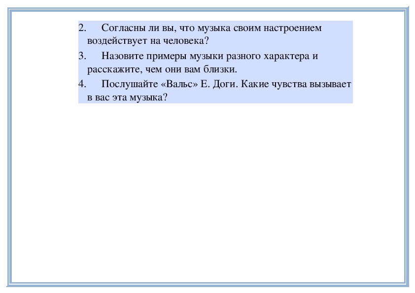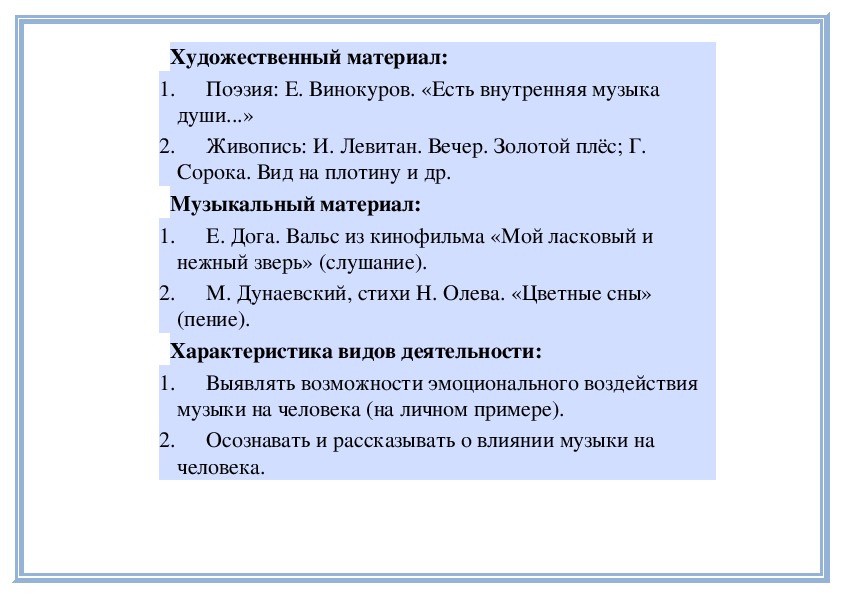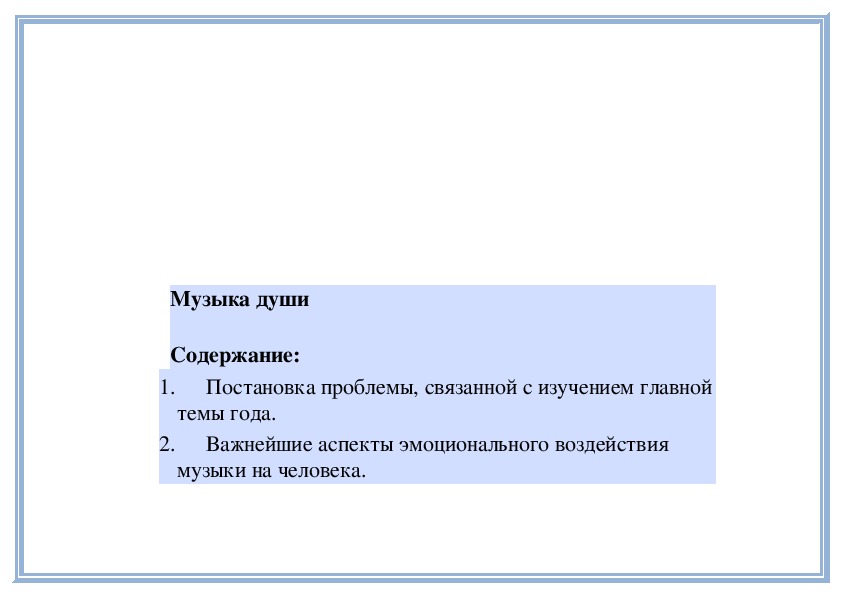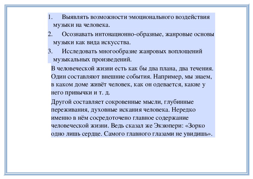 1. Выявлять возможности эмоционального воздействия музыки на человека.