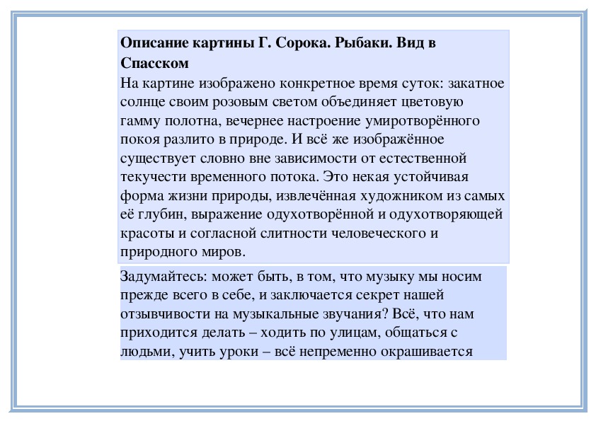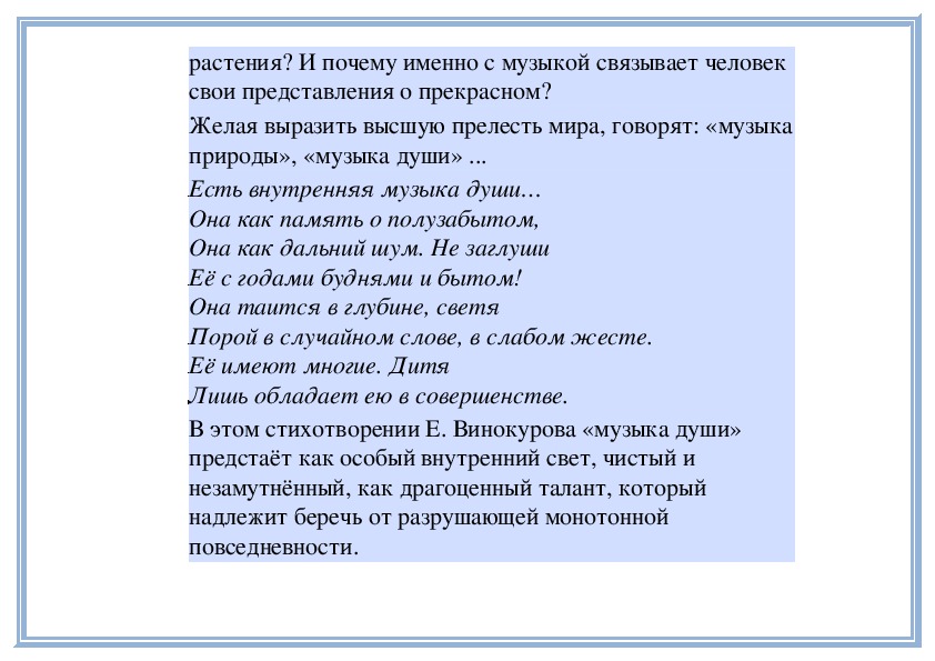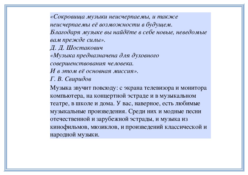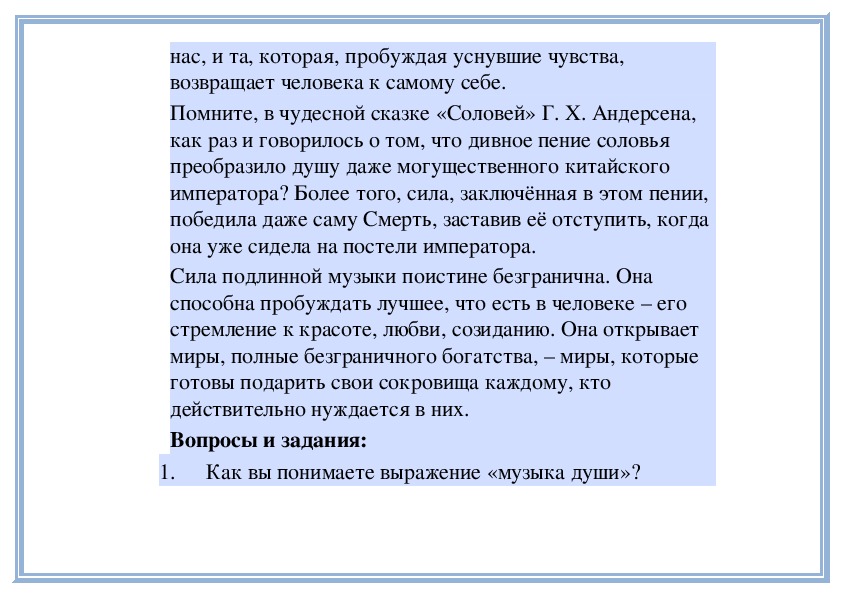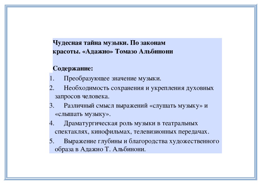 1. Преобразующее значение музыки.2. Необходимость сохранения и укрепления духовных