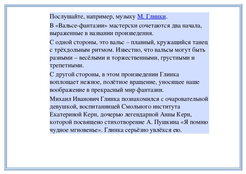 чудное мгновенье». Глинка серьёзно увлёкся ею.Слушание: М. Глинка. Романс «Я помню чудное