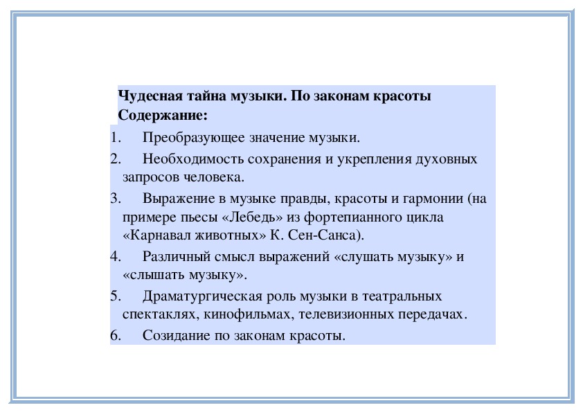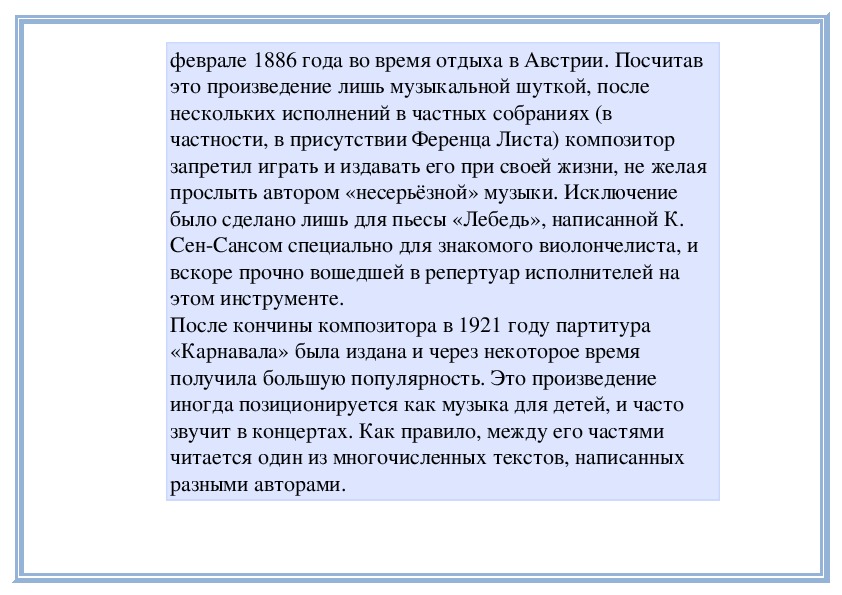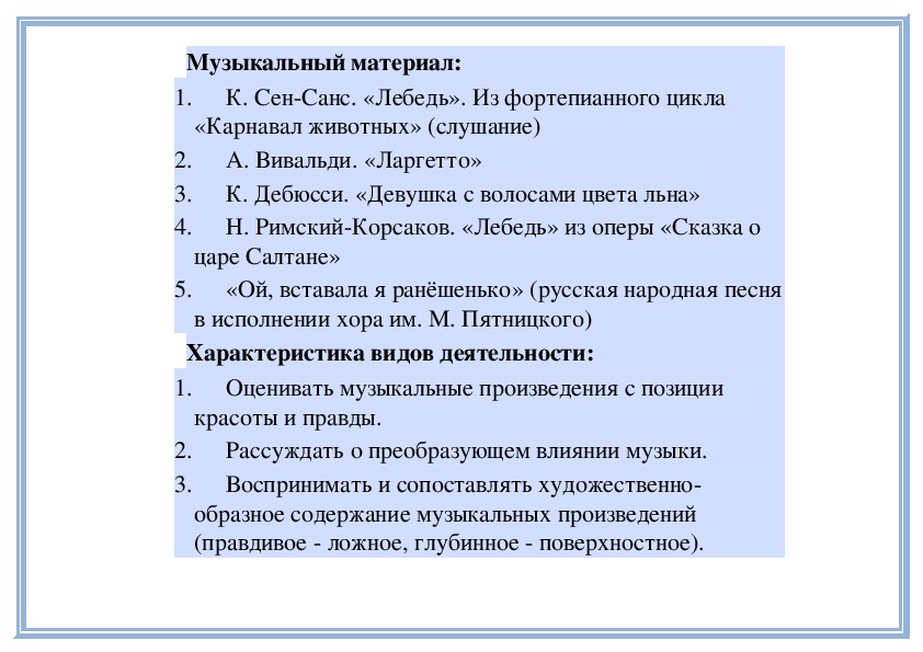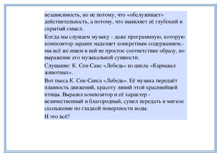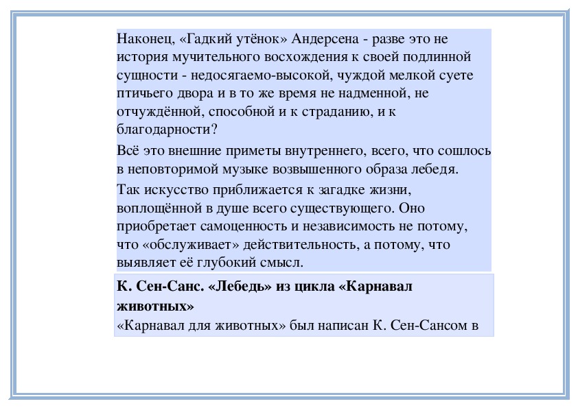 Слушание: К. СенСанс «Лебедь» из цикла «Карнавал